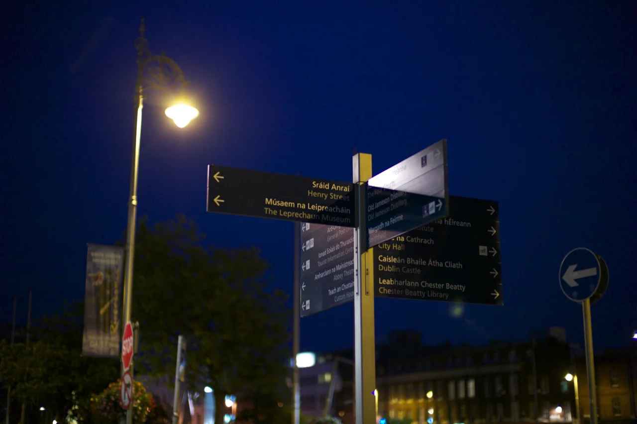 On notera que l'Irlandais qui est la langue officielle arrive en premier sur tous les panneaux. Ça calme à lire. Bhaile Atha Cliath veut dire Dublin. Moins pratique.